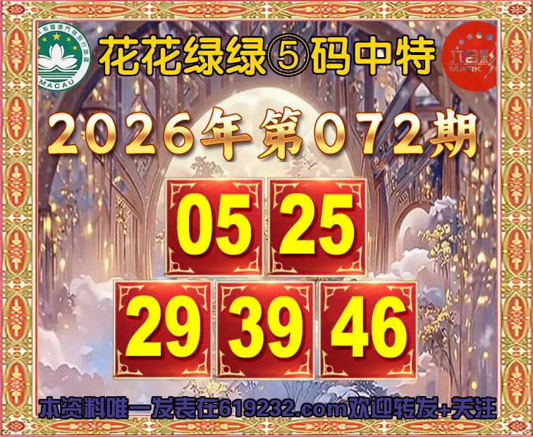 072期:【花花绿绿】 🌅⑤码中特🌅【05.25.29.39.46】开:46